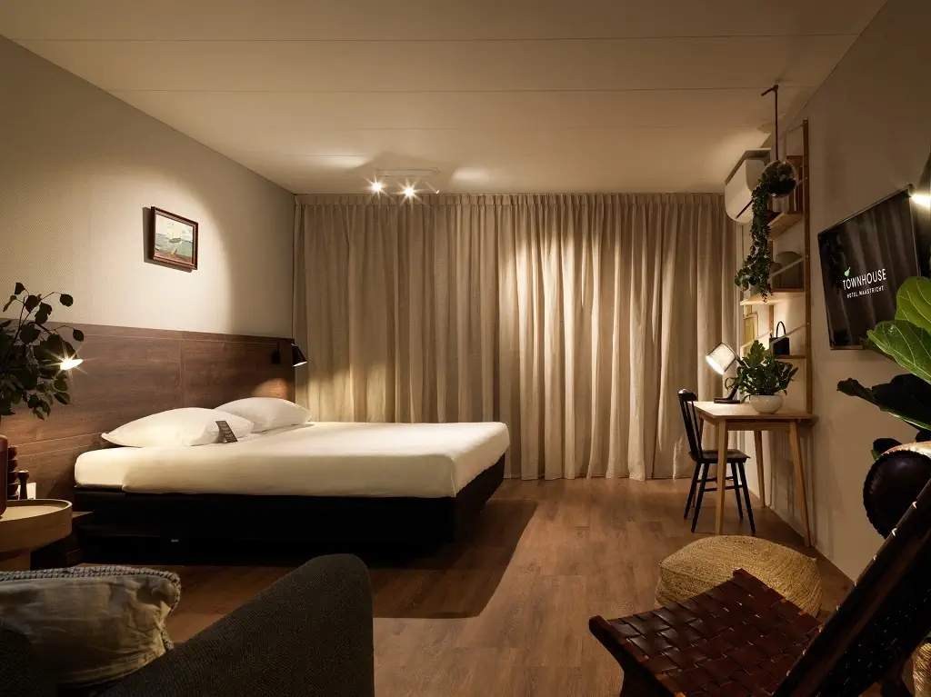 These spacious rooms with designer Artifort armchairs make a longer stay in Maastricht a comfortable experience. A few of the large rooms have a desk and/or cupboard.